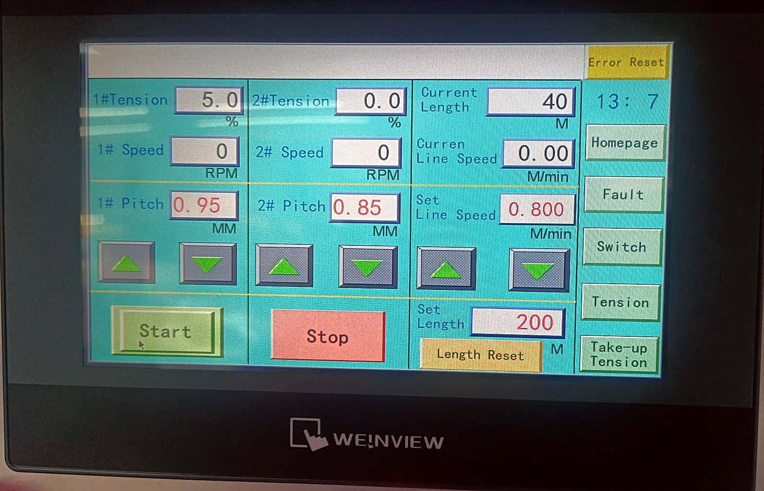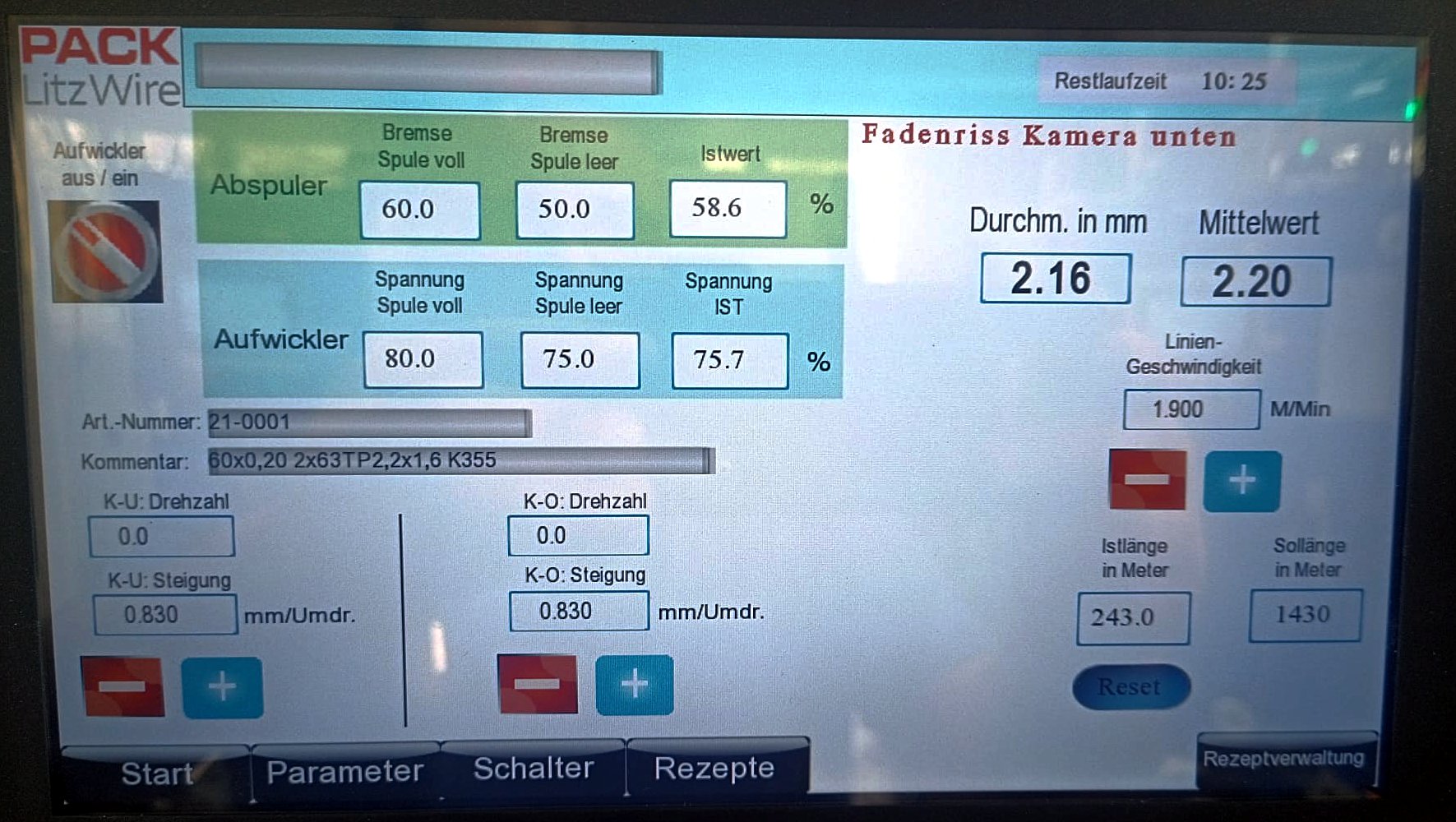 Intuitive Bedienung: Strukturierte Prozessdaten (Zugspannung, Geschwindigkeit) und integrierte Kamera-Überwachung.